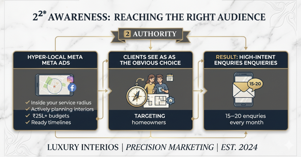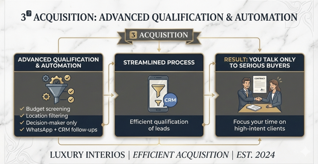 The A3 Ecosystem is a complete client-acquisition system built exclusively for luxury interior studios. It helps you generate a predictable pipeline of qualified consultations using authority positioning, hyper-local ads, and strict lead qualification.
